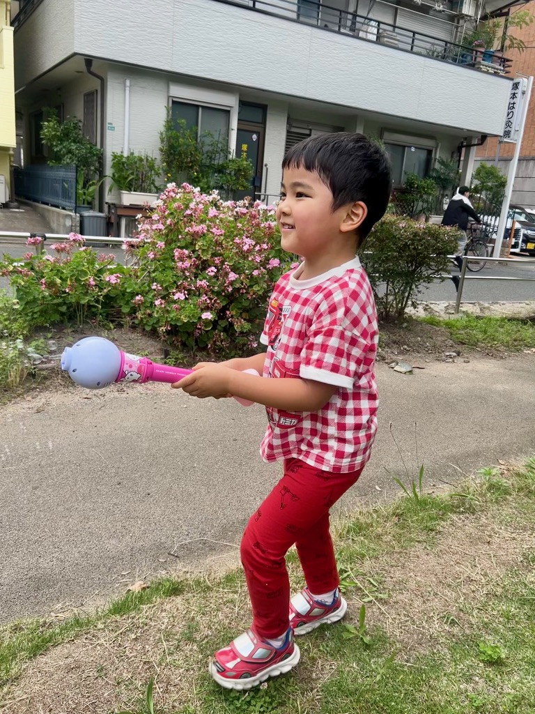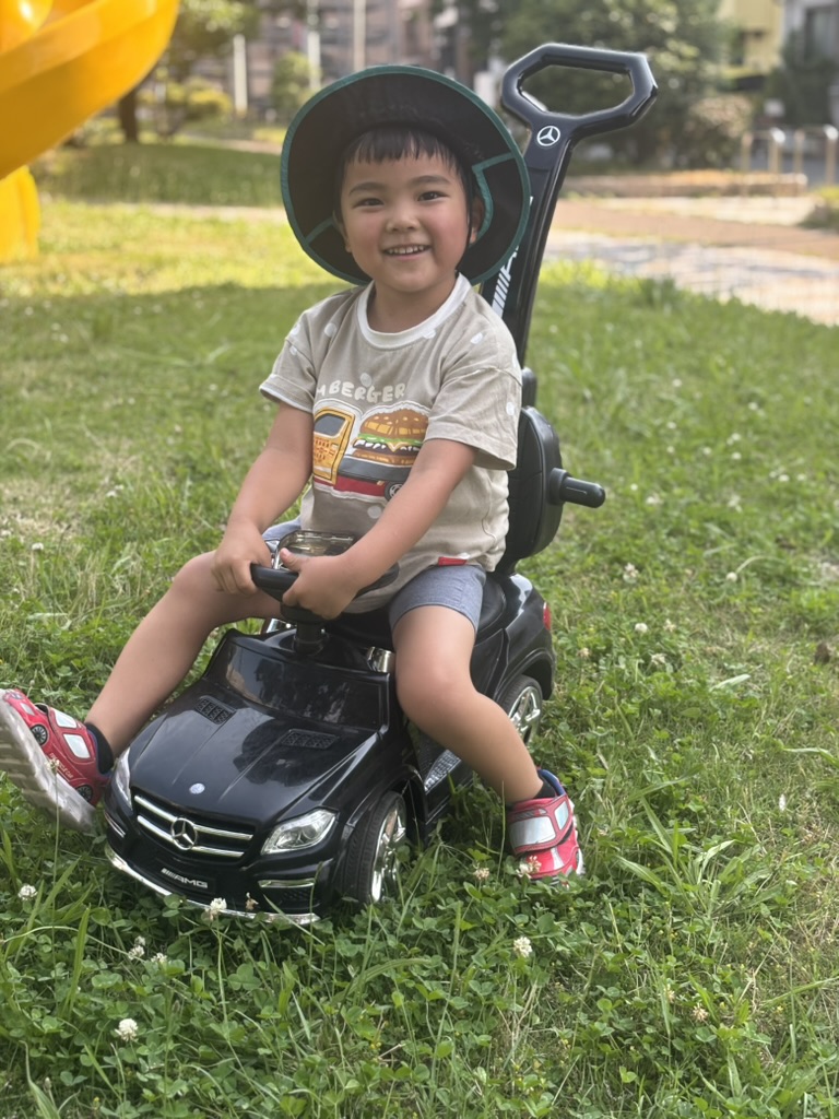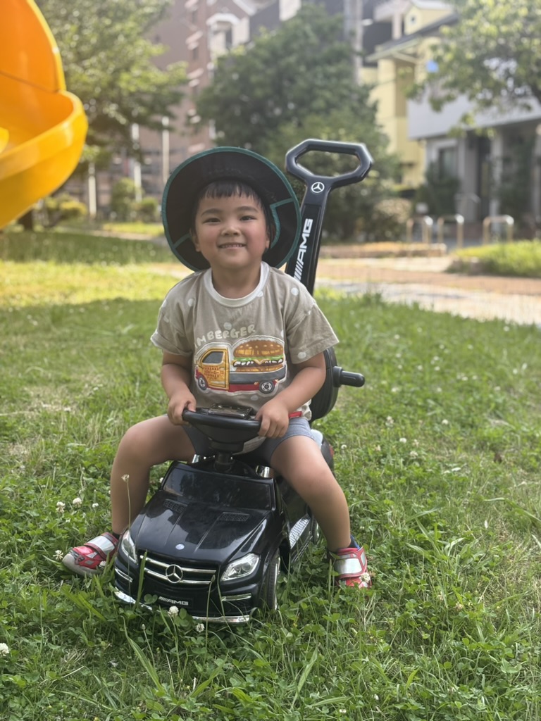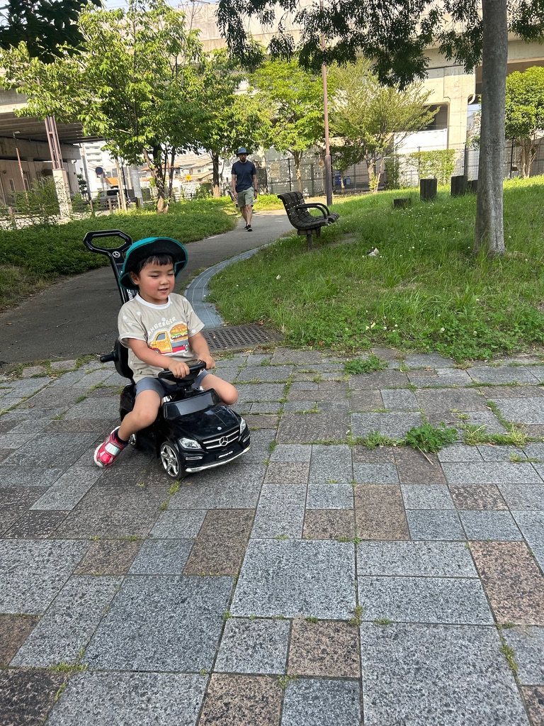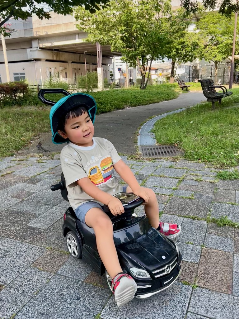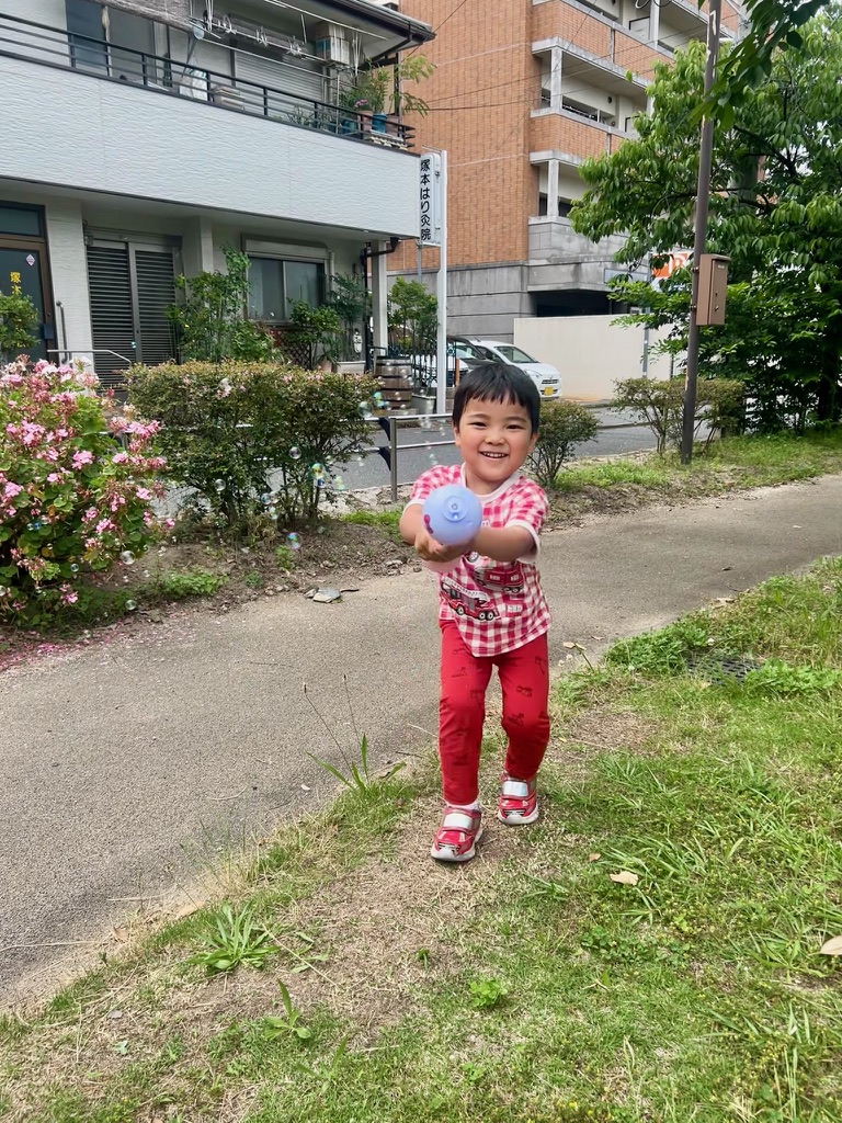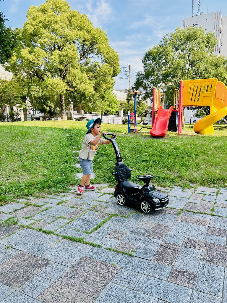 Yesterday was a rainy day, but today was a very nice and sunny day! We went to the park. Nana and Papa had fun watching me run around, drive around, and play! I used my brand new USJ bubble wand and filled the park with beautiful bubbles.