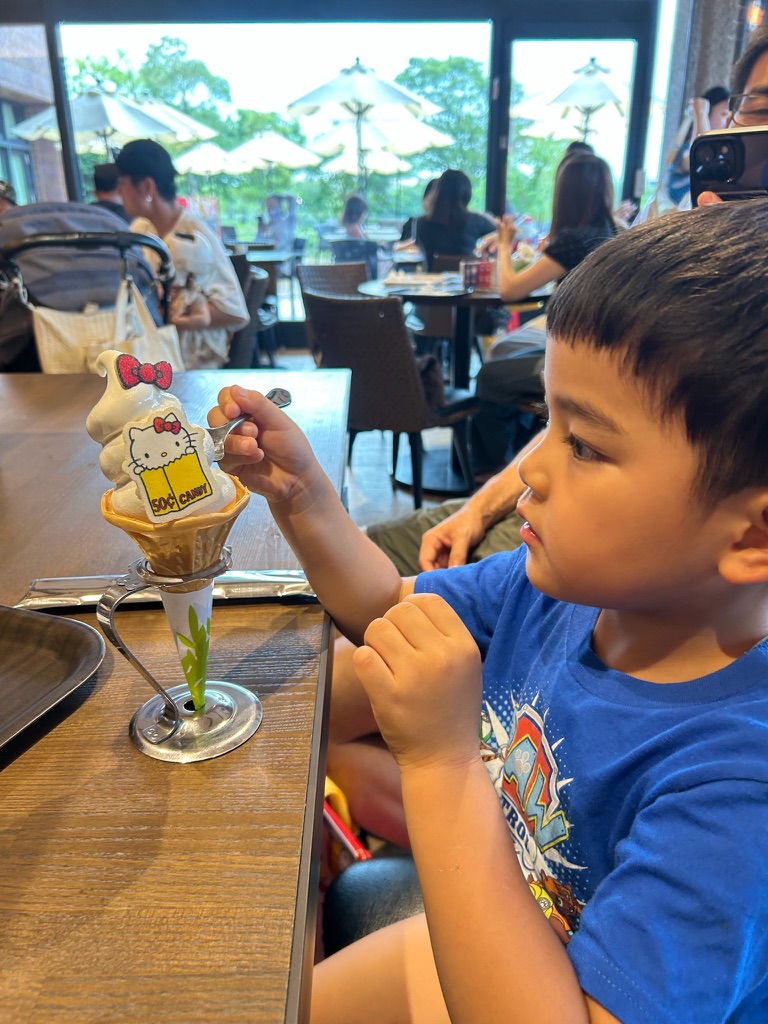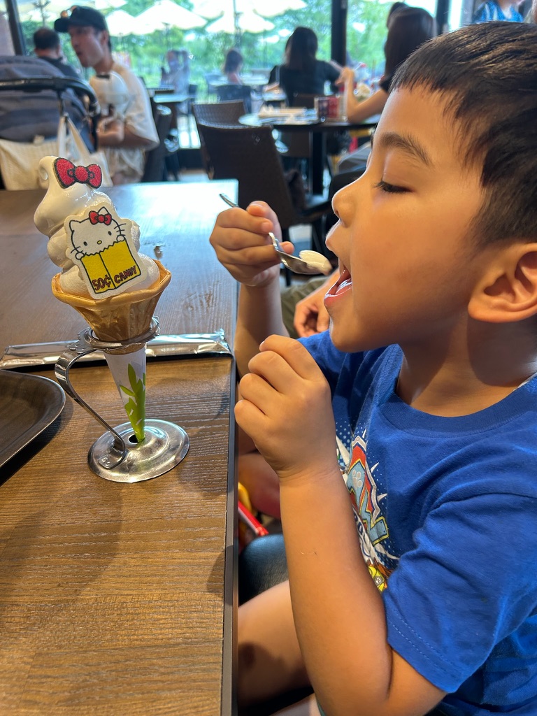 After we got in, it was really cool! There were a lot of displays, especially showing the different versions of Hello Kitty over the years. There have been 50 years worth of Hello Kitty products and Mommy and Daddy recognized a lot of blasts from the past. Daddy said he even saw some things that Aunty Chris had when she was little. I have had only a few years of Hello Kitty experience, but recognized a lot of characters and designs. It was a small exhibition but very dense. After getting through everything we stopped by the gift shop and picked up a few things. And then we headed to the cafe, because the had a special Hello Kitty ice cream that I just had to have!