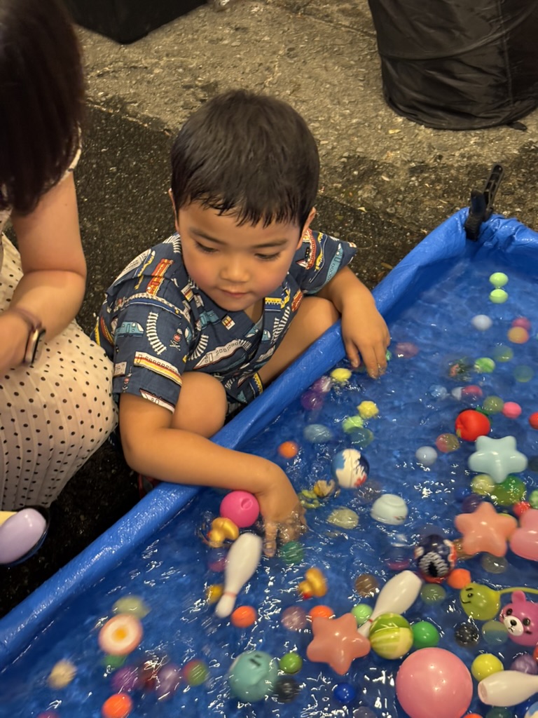After my nice cool snack I wanted to play a game so I had a go at super ball fishing. It was a bit hard so I asked Mommy to help me.