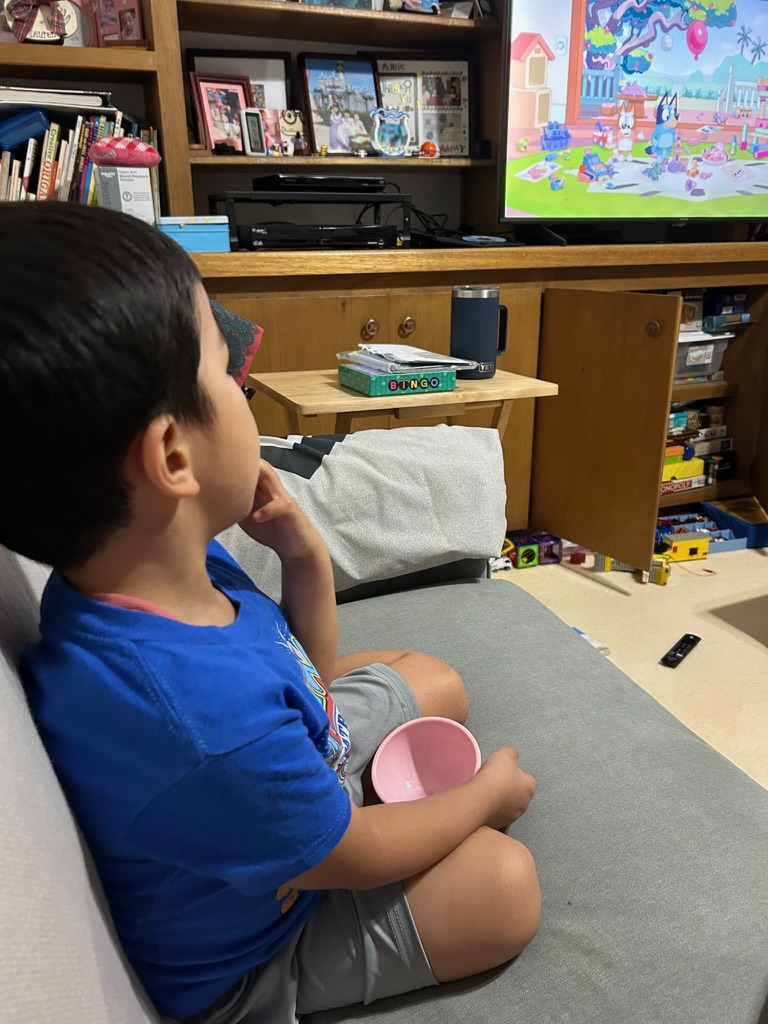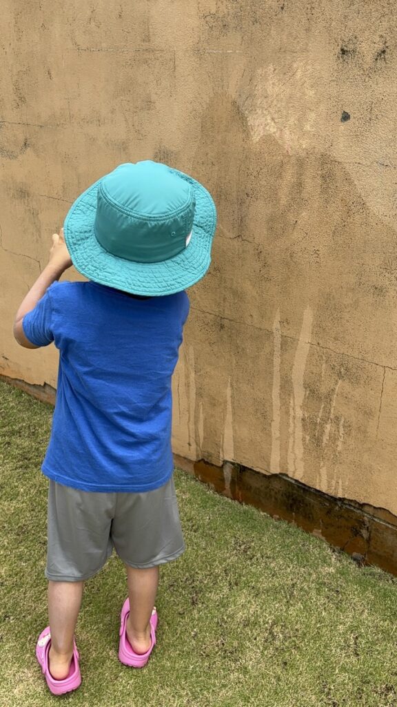 After that I played a bit but started to get into a mood again. I’ve been a very good boy this trip, but I have bad moments when I’m in a mood here and there. Instead of engaging with me, Daddy just went outside and started playing with water guns. I saw that and immediately followed him outside. Mommy had to chase me with my hat and sunscreen to protect me from the sun. We played with water guns and sidewalk chalk for a bit before Mommy, Daddy, and Papa had to go someplace. I stayed home with Nana and we played on our iPads.
